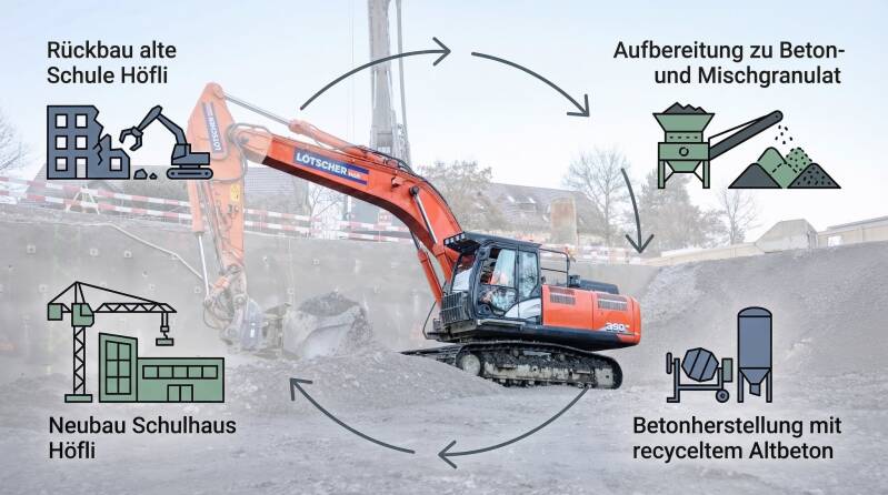 Dennoch wird später im Hochbau des neuen Schulhauses Höfli auf Recyclingbeton gesetzt: überall dort, wo es technisch möglich und sinnvoll ist. Ohnehin ist Nachhaltigkeit beim Schulhausneubau ein zentrales Thema. Das Ziel: Einen grossen Komfort mit minimalem Energieaufwand zu erreichen. Geplant ist, den Ersatzneubau nach «Minergie-P» zu zertifizieren.